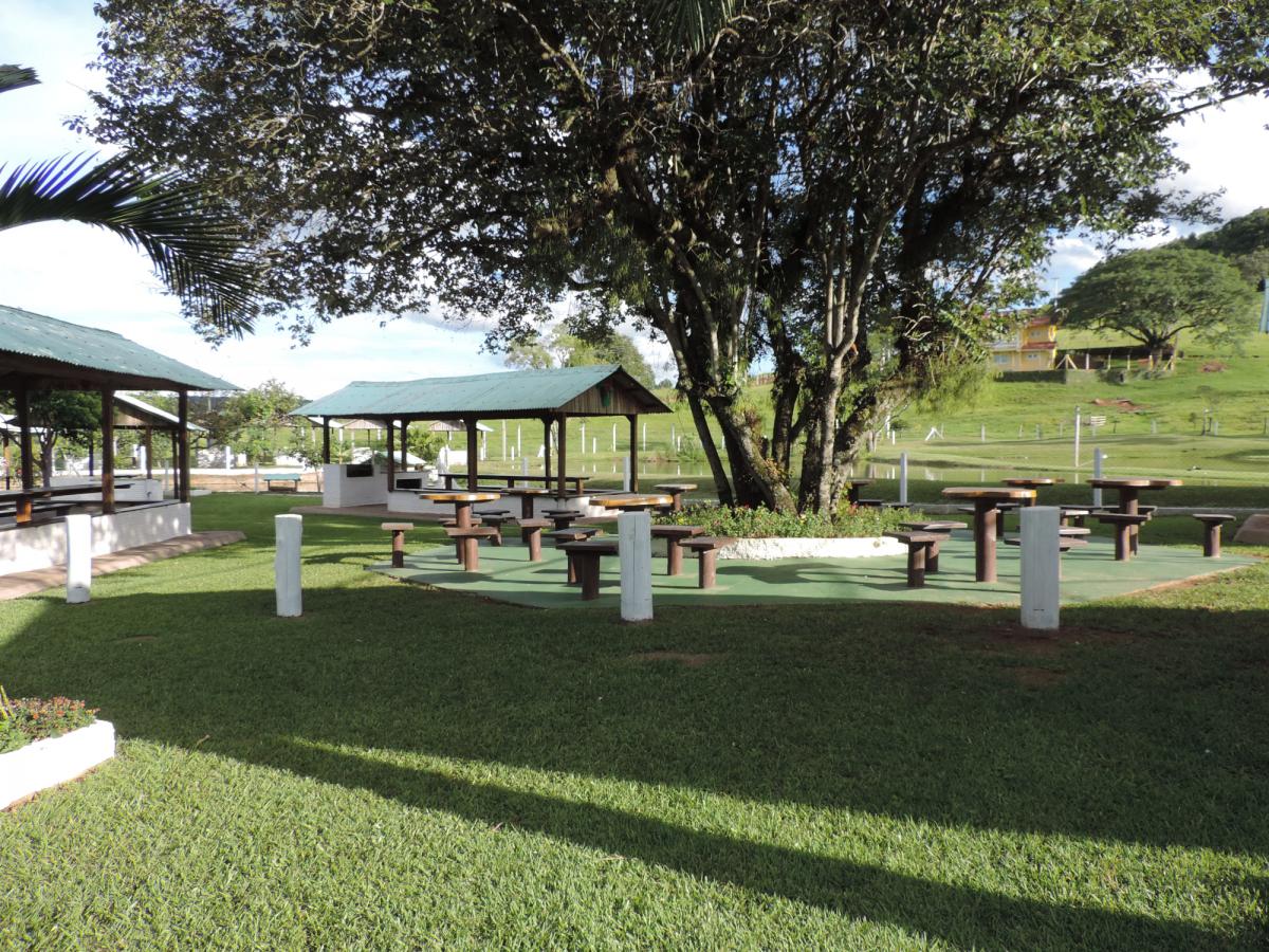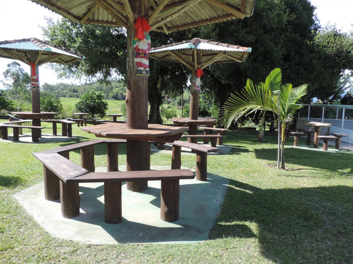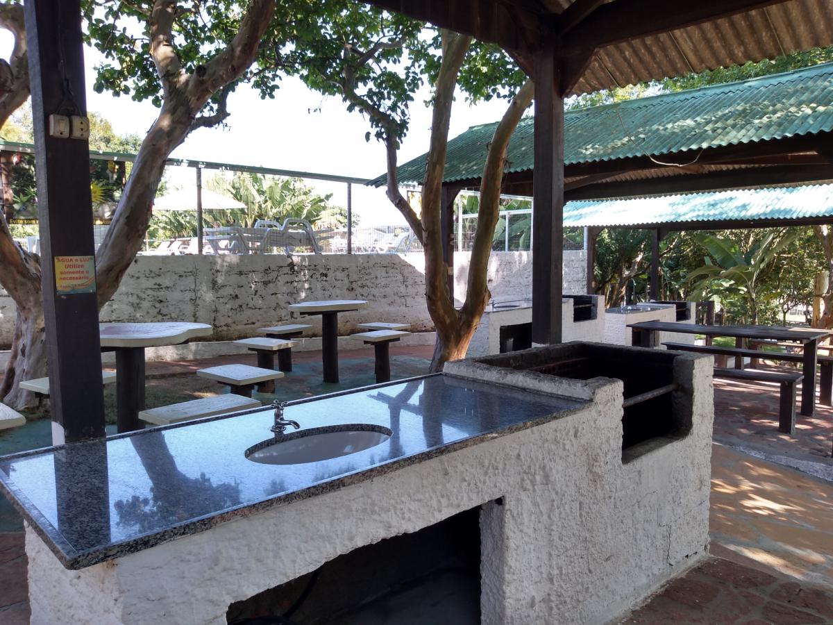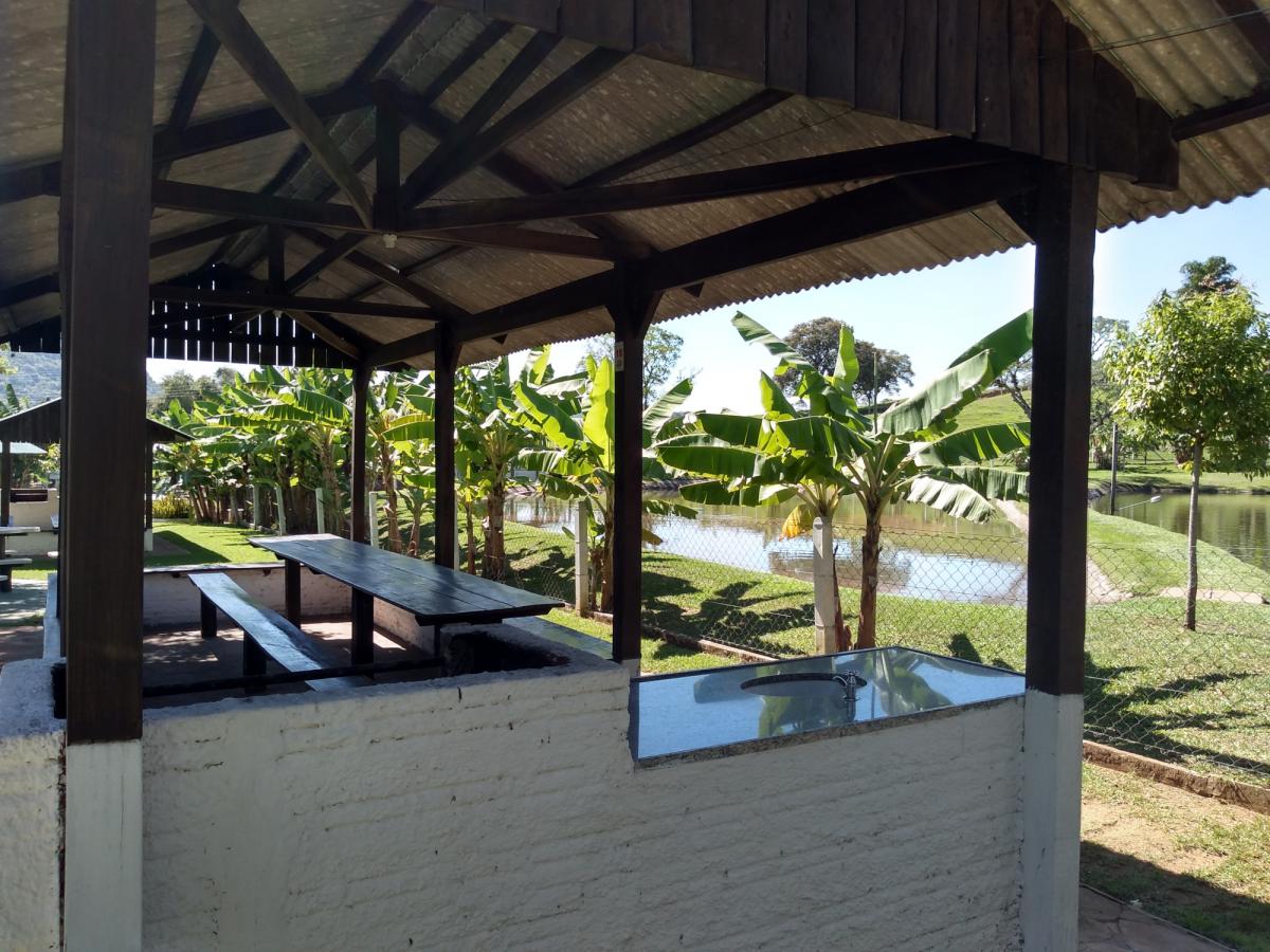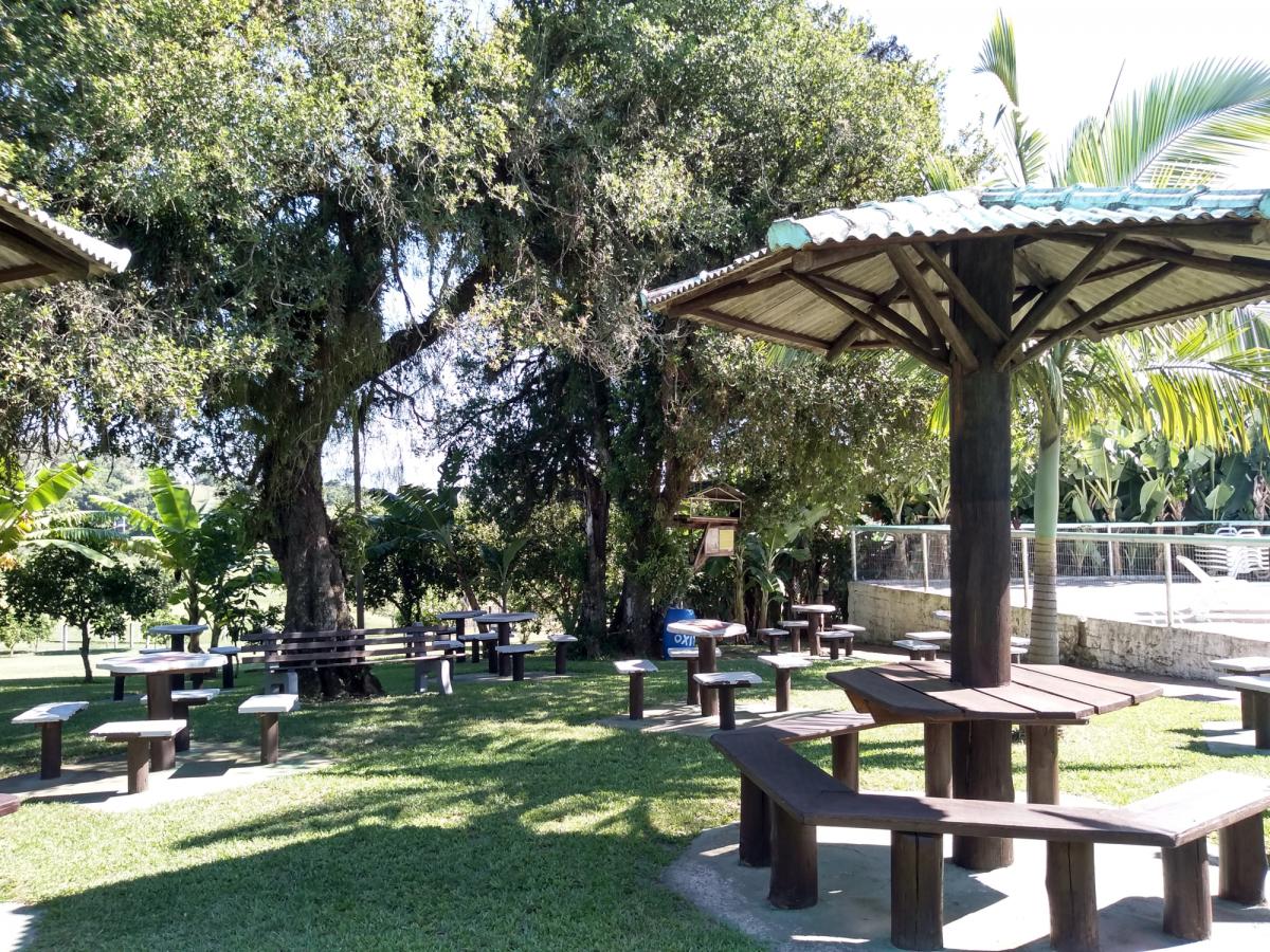 Quiosques cobertos com mesa, pia, churrasqueira localizados próximos aos lagos.