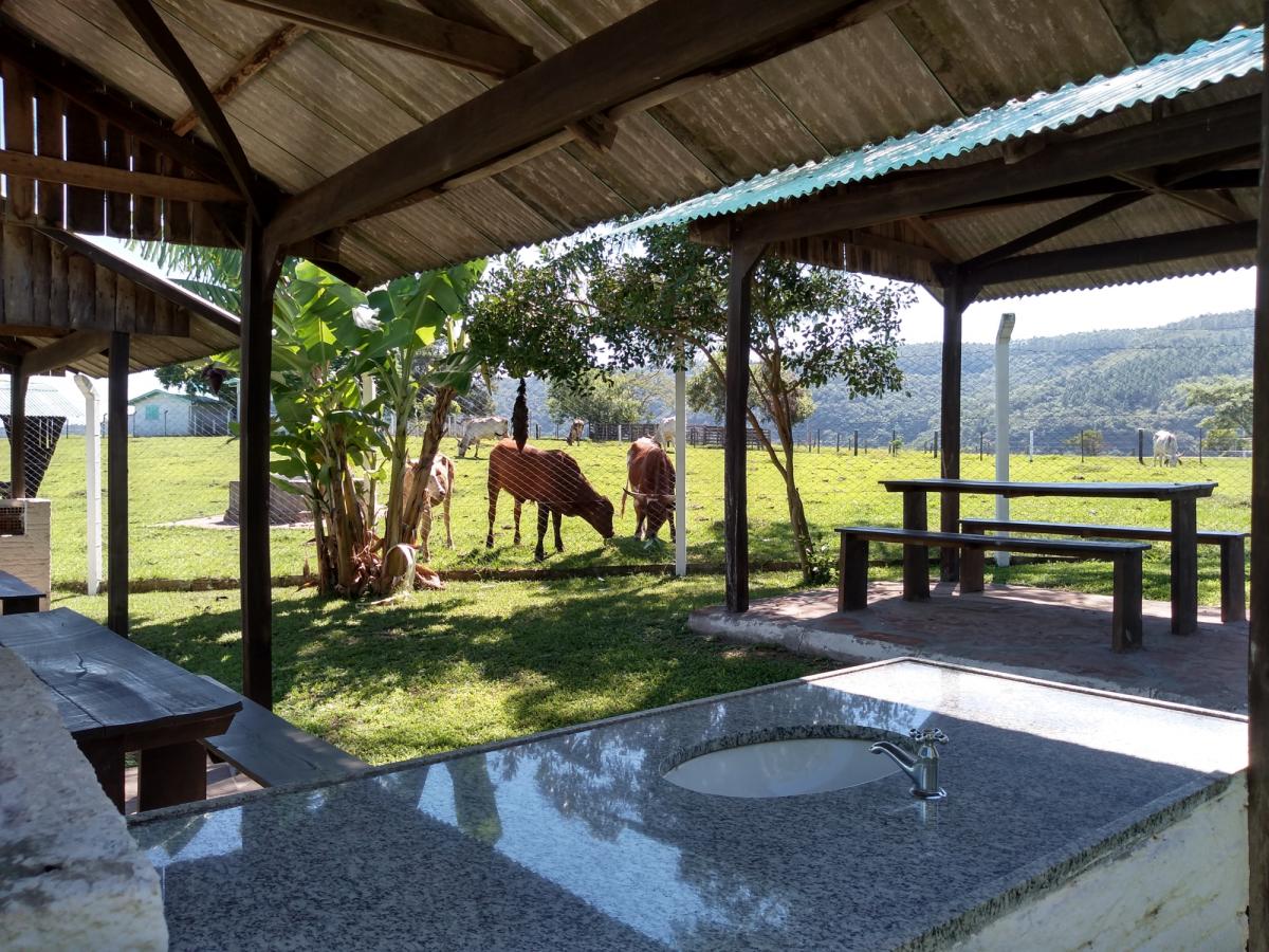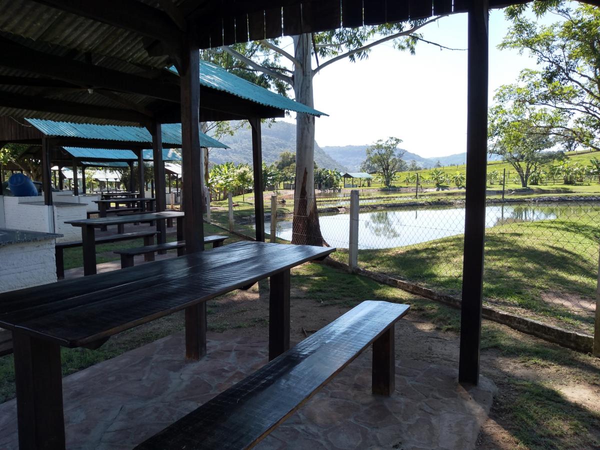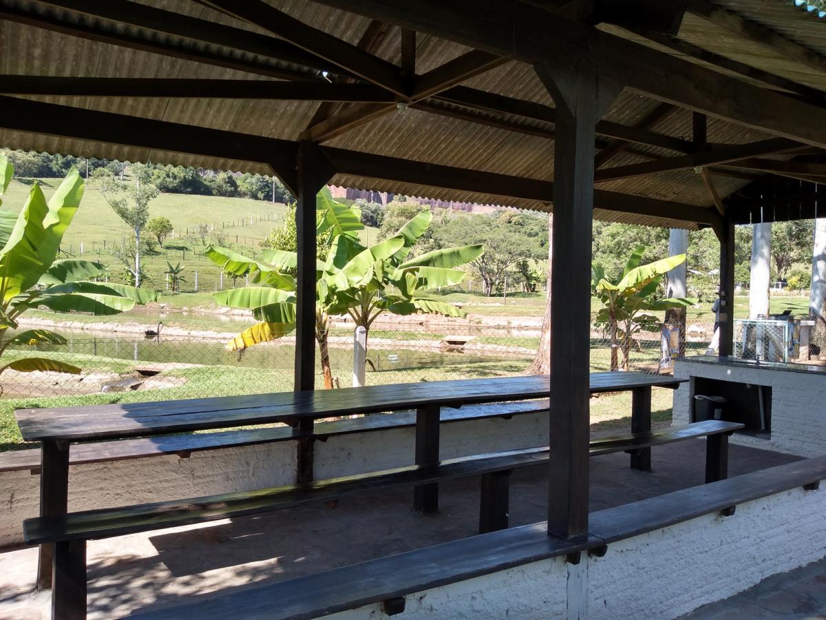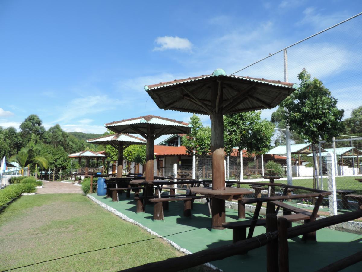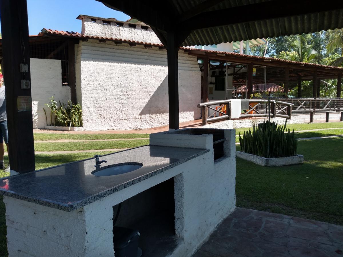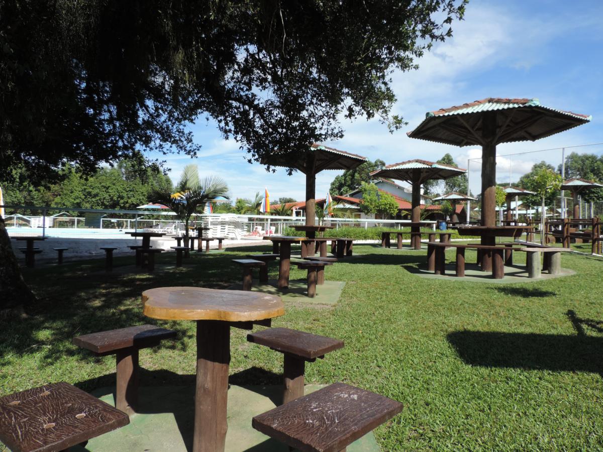 Quiosques cobertos com mesa, pia, churrasqueira localizados próximos aos lagos.